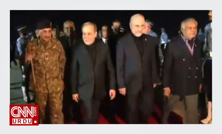 ایرانی وفد کا استقبال فیلڈ مارشل عاصم منیر، نائب وزیراعظم اسحاق ڈار۔ وزیر داخلہ محسن نقوی اور اسپیکر قومی اسمبلی نے کیا۔